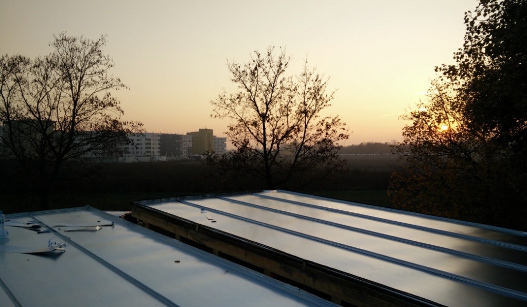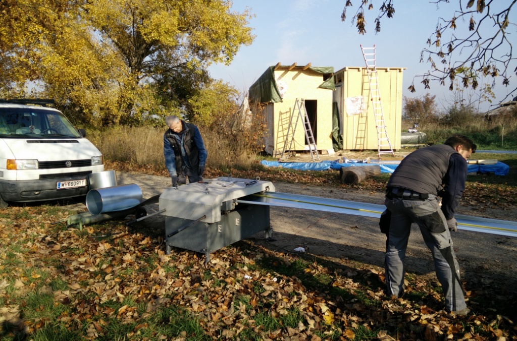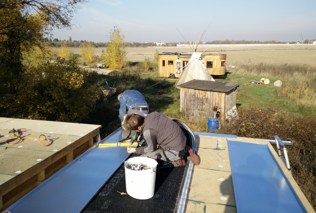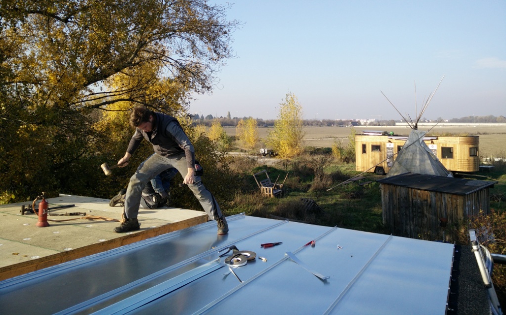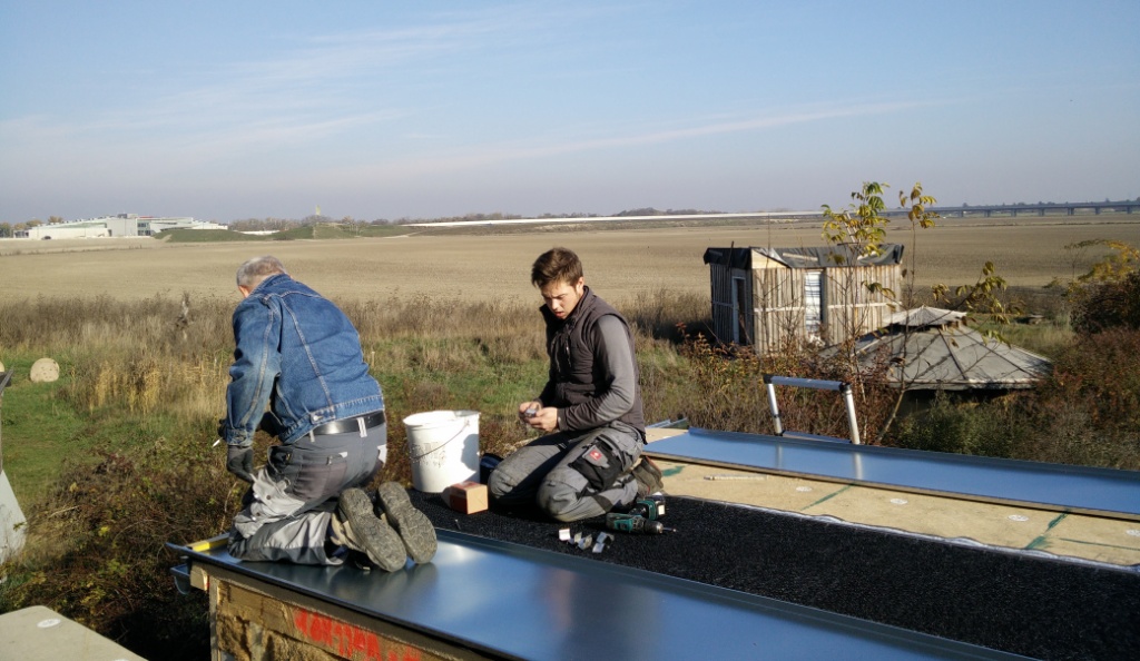 Gestern war ein richtig prächtiger warmer Herbsttag, genau richtig um mit dem Aufbringen des Blechdachs zu beginnen. Die Spengler machen einen großartigen Job und ich lerne wie ein Stehfalzdach gebaut wird. Faszinierende und sehr ausgefeilte traditionelle Technik. Effektiv mit einem Minimum an Material- und Ressourcen Einsatz.